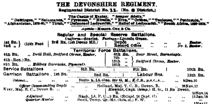 Regimental Details of the Devonshire Regiment (As Published in the Army List of August 1918) |