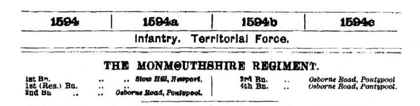 Formation and Early Years of The Monmouthshire Regiment Prior to the Childers Reforms of 1881, units of Rifle Volunteers were formed throughout Great Britain in 1859 and 1860 in response to a perceived threat of invasion by France. The raising of these units was to be authorised by Lord Liieutenants of counties in England, Wales and Scotland. The first Rifle Volunteer Corps in Monmouthshire was raised on 9 September 1859. By 1880 the various small Rifle Voluteer Corps units (company sized) in the county had been reorganised into three Battalion-sized units, the 1st, 2nd and 3rd Monmouthshire Rifle Volunteer Corps. In the following year the Childers Reforms saw the three Monmouthshire RV Corps becoming Volunteer Battalions of the regular South Wales Borderers. In 1885 they were redesignated as the 2nd, 3rd and 4th Volunteer Battalions of the South Wales Borderers (the 1st Volunteer Battalion being formed at the same time from the 1st Brecknockshire Rifle Volunteers). Under the Territorial and Reserve Forces Act of 1907 these Volunteer Battalions of the South Wales Borderes were reorganised and retitled as part of a new Territorial Force (TF) . Volunteer units were transferred, with changes in nomenclature, to the new force on 1 April 1908. The three Monmouthshire Volunteer Battalions were redesignated as Battalions of a new Territorial Force (TF) only Regiment, the Monmouthshire Regiment: